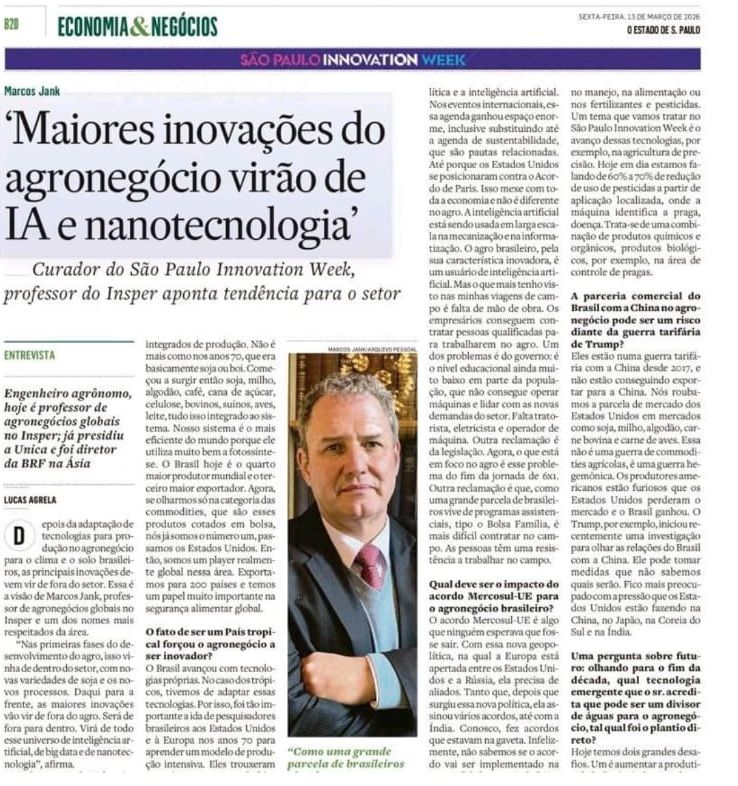 As maiores inovações do agronegócio na próxima década devem vir de fora para dentro: IA, nanotecnologia, big data e agricultura de precisão. Essa visão, destacada por Marcos Jank, reforça algo que no setor de ciência e tecnologia já está cada vez mais claro: o futuro do agro não depende apenas de produzir mais, mas de produzir melhor, com mais inteligência, eficiência e menor uso de recursos. O Brasil já mostrou ao mundo sua capacidade de inovar no campo — da tropicalização de culturas ao plantio direto, da integração lavoura-pecuária aos avanços em bioenergia. Agora, o próximo salto deve acontecer com a convergência entre dados, automação, biotecnologia e nanotecnologia. Em especial, a nanotecnologia tem potencial para transformar profundamente o setor, com aplicações que podem contribuir para: